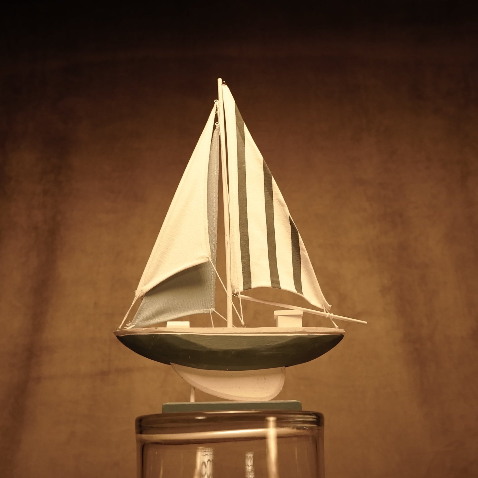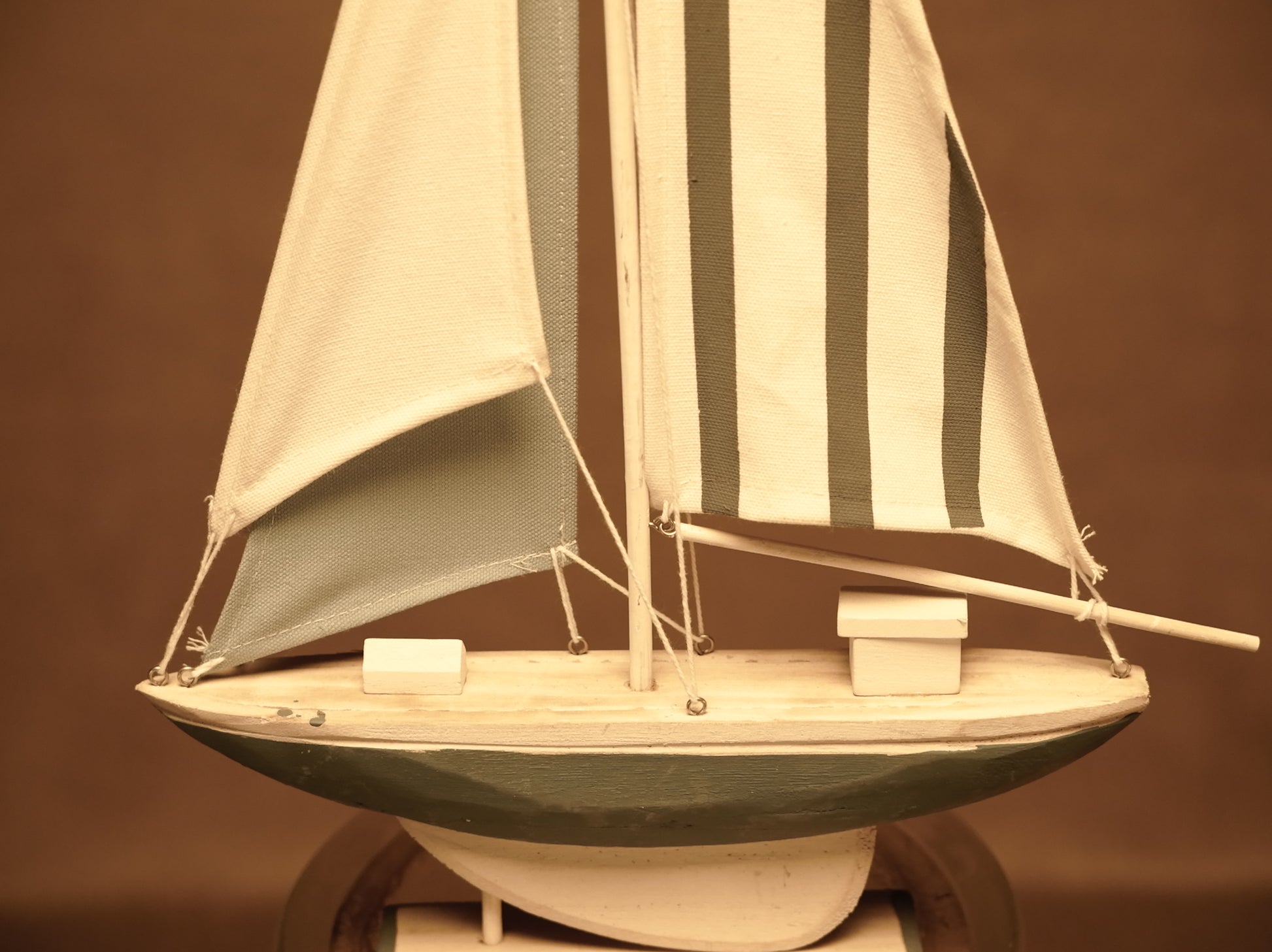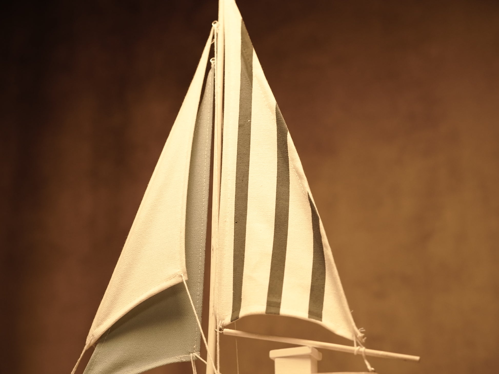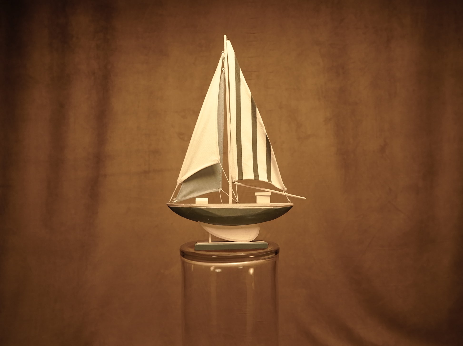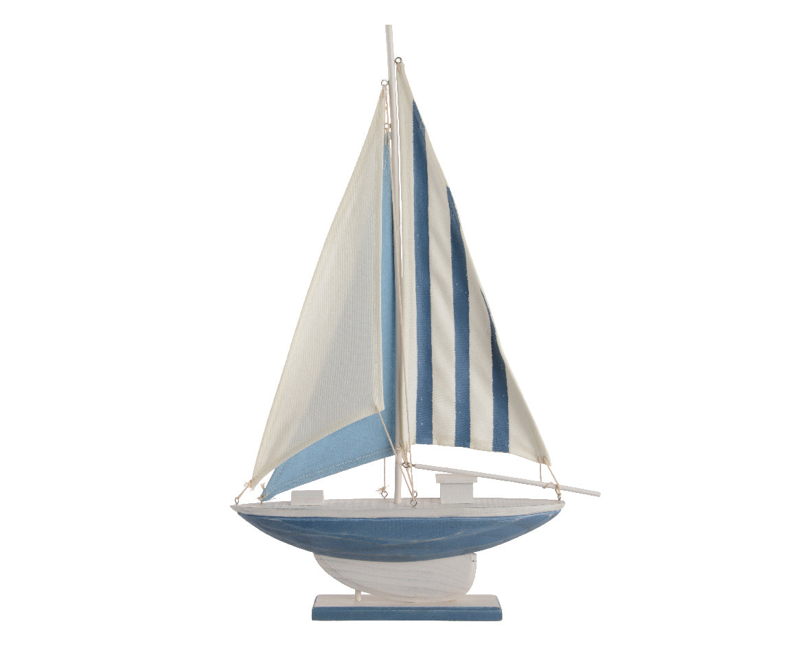 Das dekorative Segelboot ist ein handgefertigtes Stück, das jedem Raum eine nautische und elegante Note verleiht. Dieses fein aus handgeschnitztem Holz gefertigte Segelboot mit Baumwollsegeln in Weiß- und Blautönen ist ideal für Liebhaber des Meeres und der Meeresdekoration.