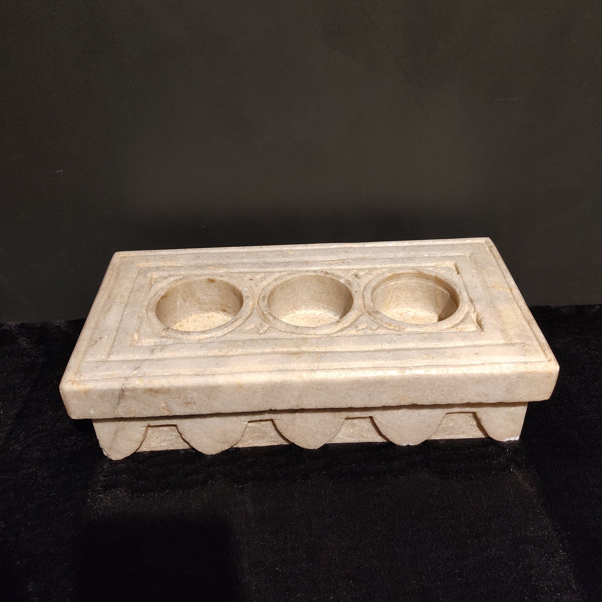 El Portavelas de Agra número 3 es una exquisita pieza decorativa fabricada artesanalmente en mármol de la India. Su diseño tallado a mano con motivos geométricos añade un toque rústico y auténtico, perfecto para iluminar tus espacios con elegancia. Disponible en tonos naturales de blanco y ocre, es ideal para complementar una decoración de estilo vintage o boho. Cada pieza es única debido a su proceso artesanal, lo que convierte este portavelas en un detalle decorativo inigualable.